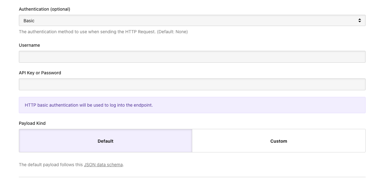 Start by selecting HTTP in the service picker, then enter the URL of your endpoint, and a username and API key or password (depending on the authentication method you have set up on your endpoint), if you want to, or just select None.