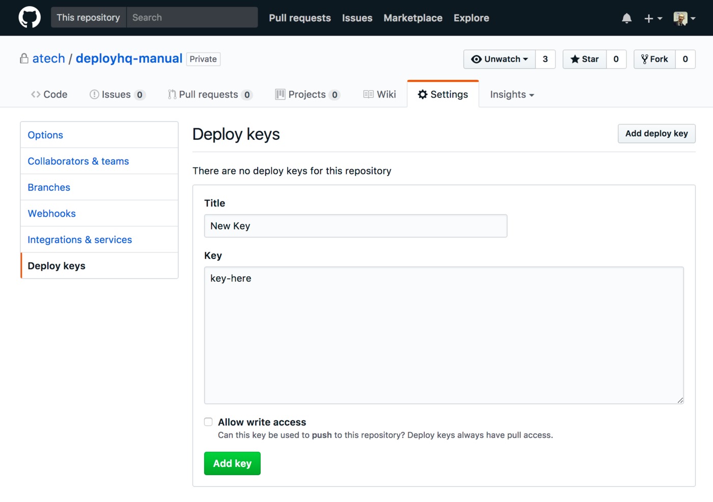 To add a new deployment key to your GitHub repository, go to the Settings tab above your repository browser, then Deploy Keys on the left hand side. Next click the Add deploy key button above the list of keys.